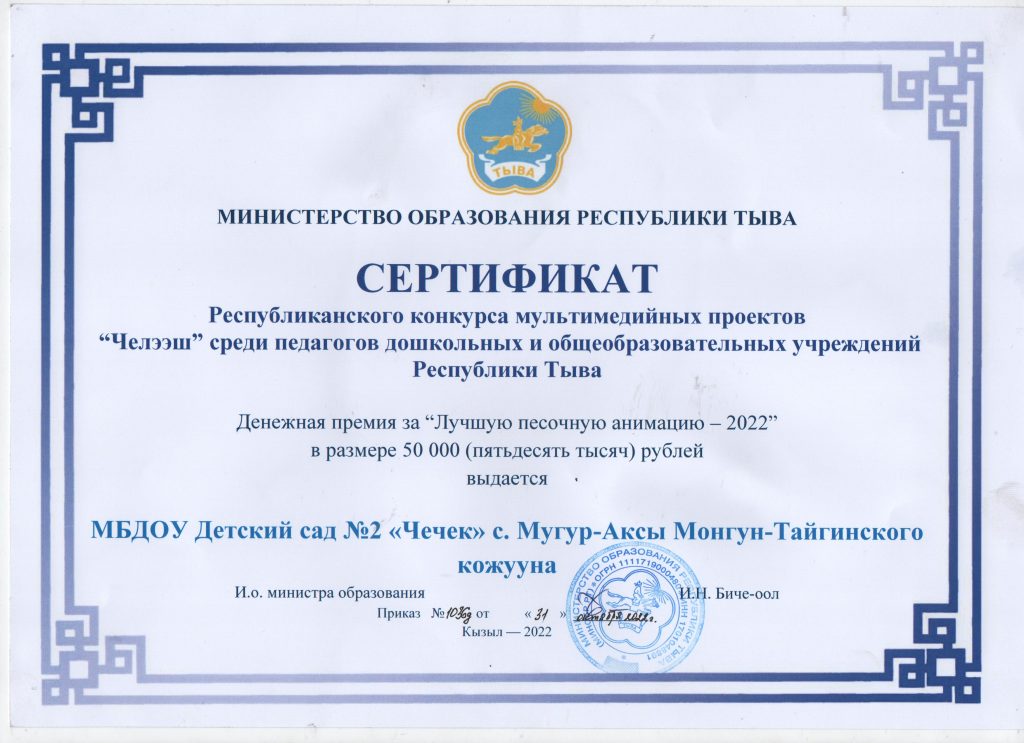 Наши педагоги сочинили авторские тувинские сказки на тувинском языке и создали тувинские мультфильмы в 3 разных видах анимации: кукольная анимация «Кым эң-не ажыктыгыл?», песочная анимация «Кежээпей Ак-кыс», пластилиновая анимация «Найыралдыг өңнүктер» и «Ирбиш оглунуң ужуралдары».