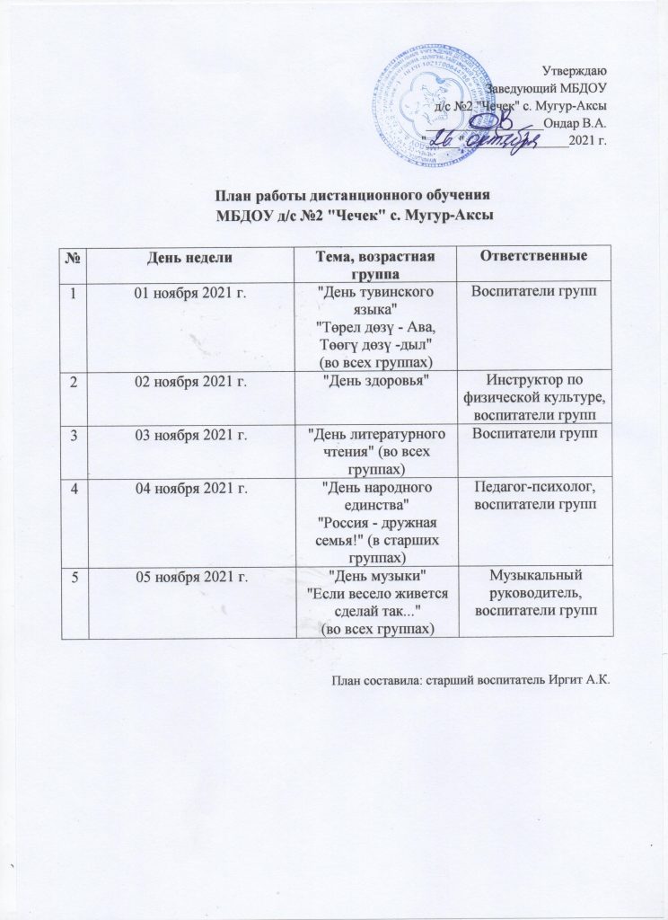 План работы дистанционного обучения